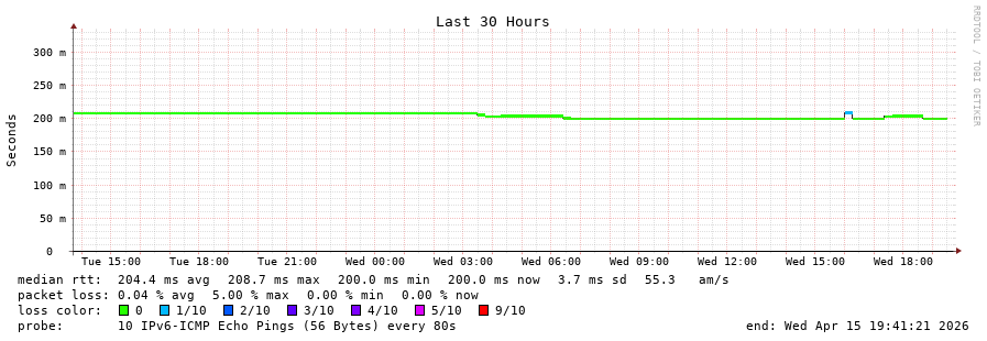 traceroute to 2402:1f00:8400::2:0:19c (2402:1f00:8400::2:0:19c), 30 hops max, 80 byte packets - Generated at 2026-04-15 19:00:02